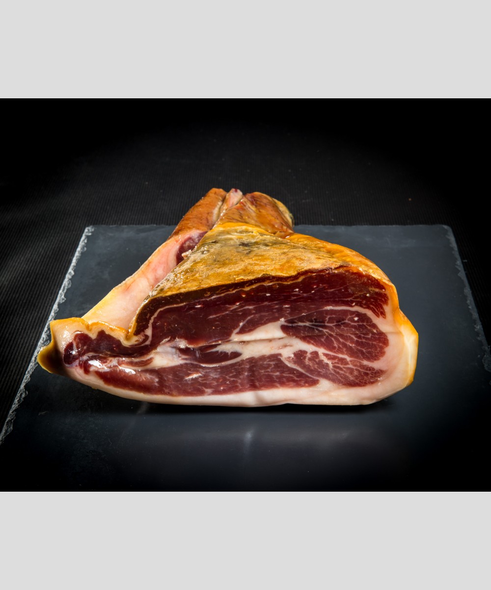 100% pure race et plus de 30 mois d’affinage pour ce jambon Serrano Duroc désossé ! Élevés en plein air, ces cochons aux pattes et pieds blancs ont la particularité génétique d'infiltrer le gras de son alimentation au sein de ses muscles, ce qui donne des gros jambons très persillés avec une longueur en bouche très supérieure aux autres Serranos, et une texture en bouche proche des jambons ibériques cebo de campo.