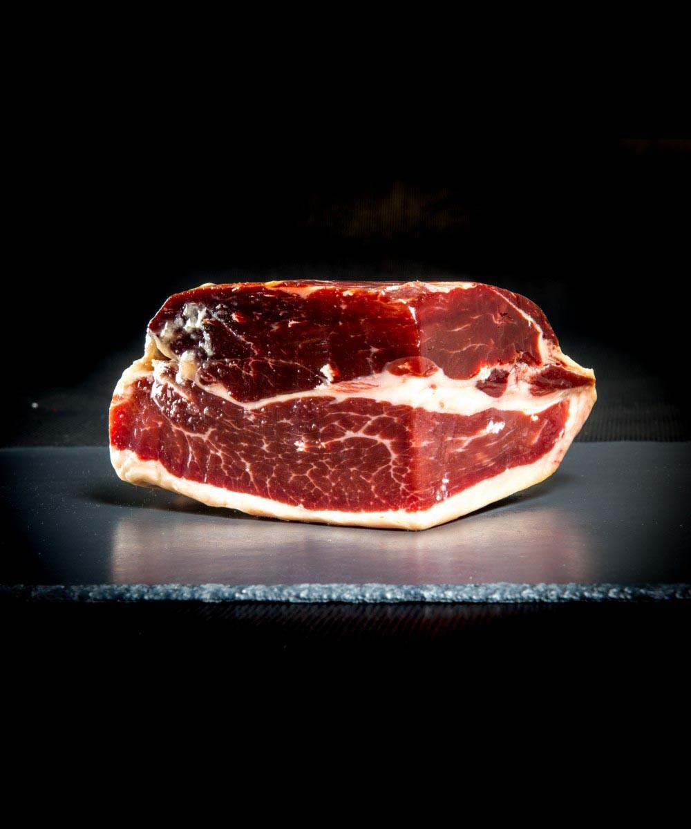 Il provient de jambons de porcs ibériques de bellota qui ont été affinés 48 mois minimum par séchage exclusivement naturel, à Guijuelo.
